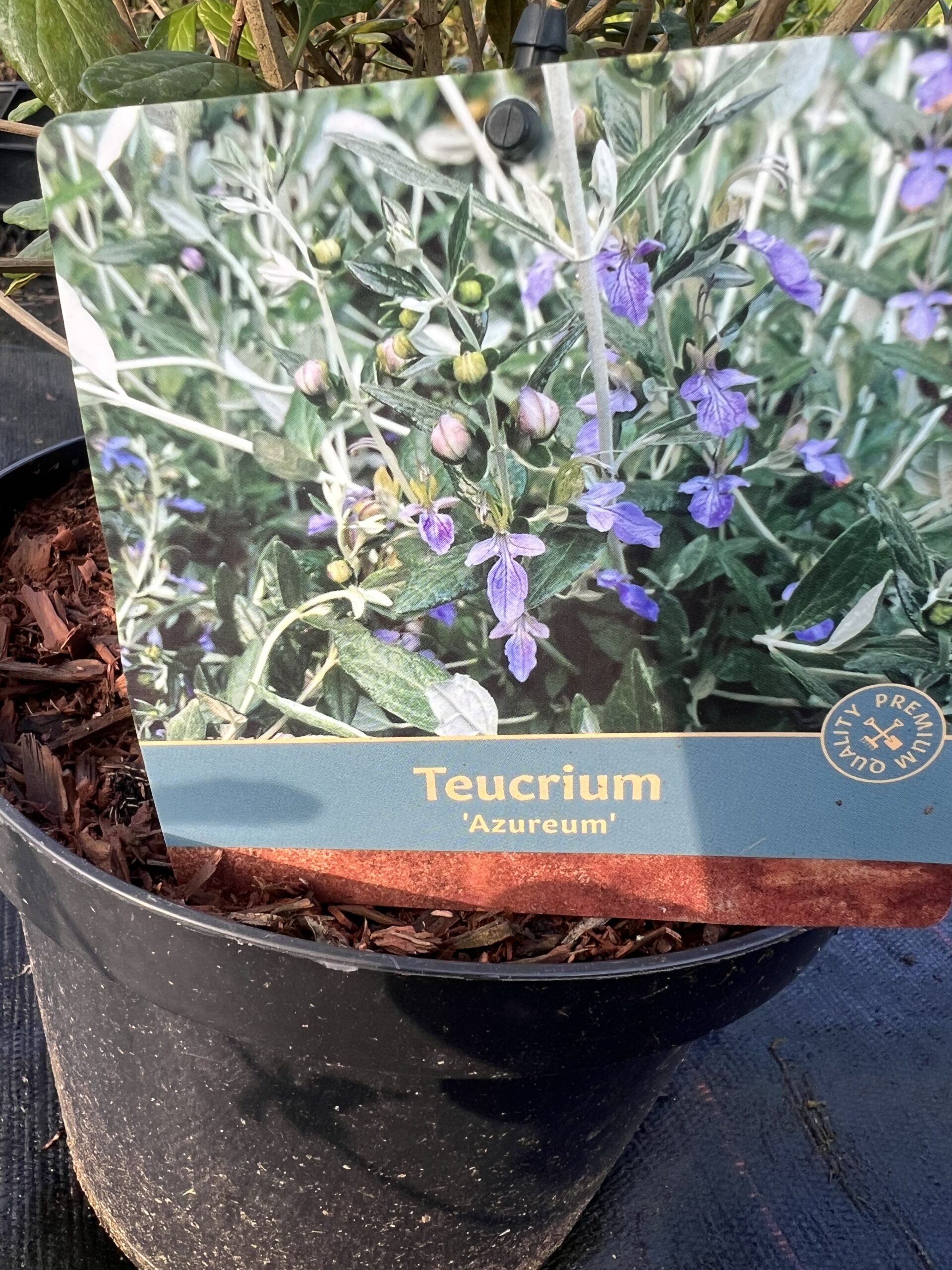 ook bekend als Gamander Azureum’ of Azure Bush Germander, is een groenblijvende, mediterrane struik gewaardeerd om zijn zilvergroene, aromatische bladeren en opvallende, intens blauwe bloemen, die bijen aantrekken. Deze onderhoudsarme struik gedijt in volle zon en goed doorlatende grond, is droogte- en hittebestendig en matig winterhard, ideaal voor mediterrane tuinen, lage hagen of als solitair.